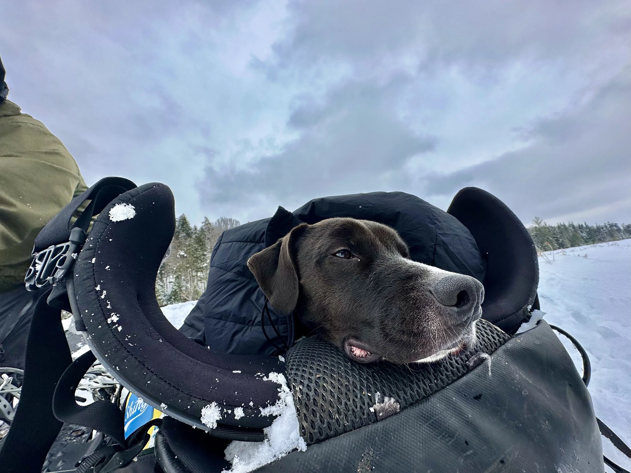 I’ve been doing more fieldwork than normal this month, which means Nico has been as well. He isn’t built for the cold, so I have to be selective on which days he comes out with me. If it’s below 20°F he’ll get chilled quickly when we stop. Today was nice and warm so he joined in on a long day of sampling remote lakes. When we stop to do our work I lay my pack down and he curls right up on it. My colleague even covered him up with his coat to keep him extra warm. Needless to say, both of us will be sleeping well tonight.