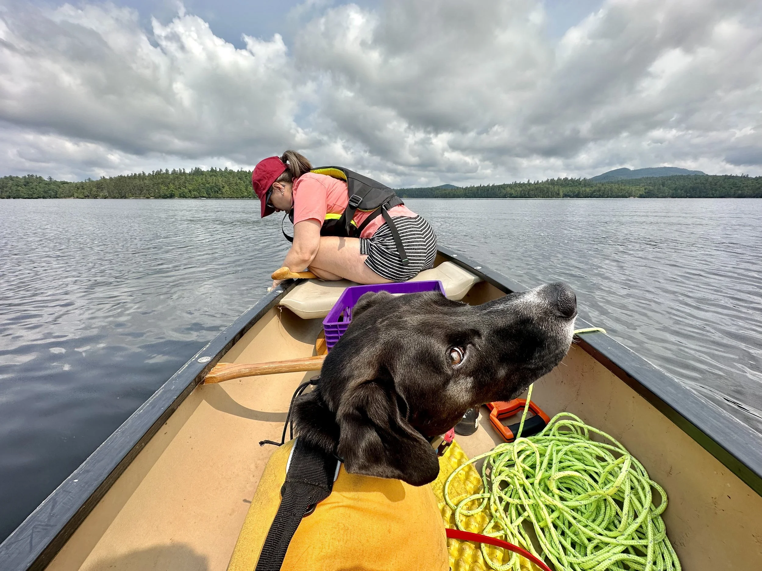 Shelly and Nico became officially trained Adirondack Lake Assessment Program volunteers today. They helped me fill in for volunteers on Middle Saranac Lake. I was a bit hesitant to bring Nico along because he tends to want to stand while in the canoe. He did so well though. He either sat or laid down the entire time, much thanks to all our training work. He also didn’t flip is getting in or out of the canoe while excited by all the people at the launch. We took him out on Lower Saranac Lake afterward as a reward so he could go swimming.